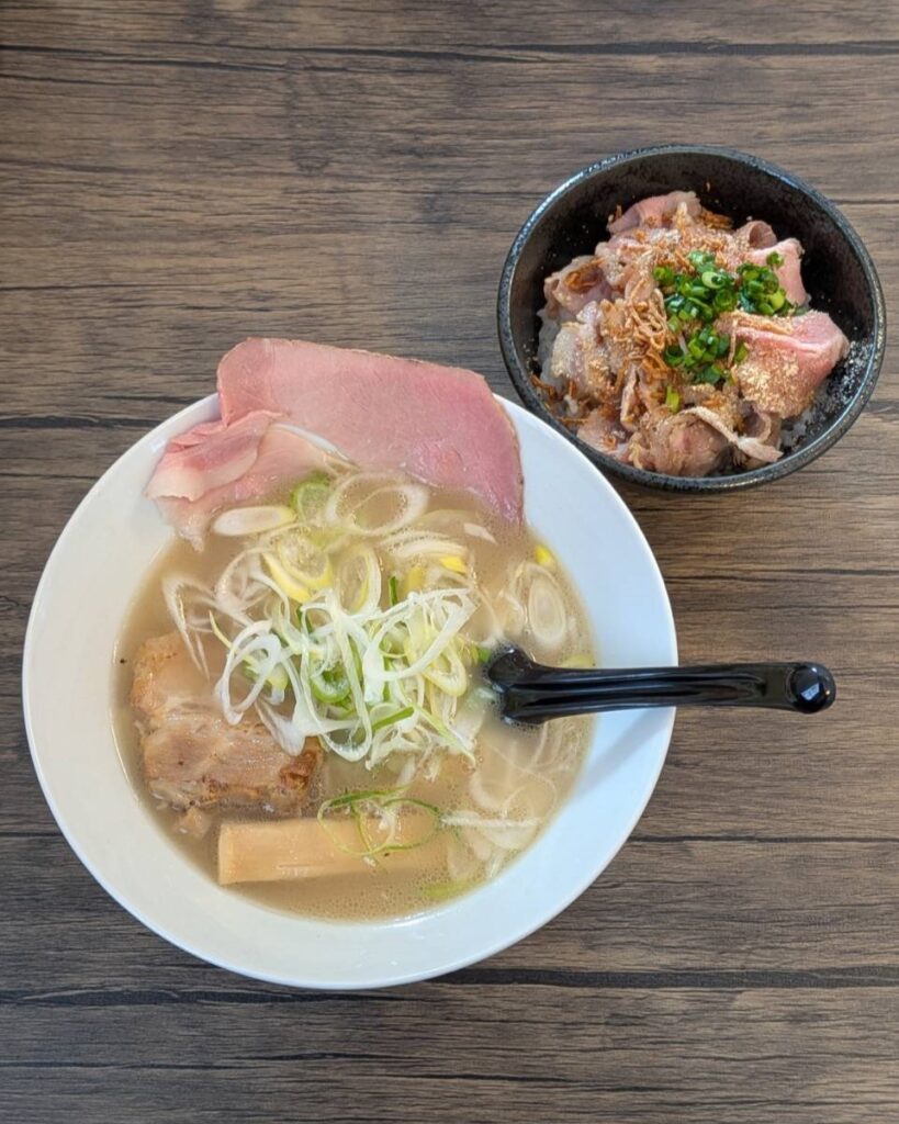 今回選んだのは「塩白湯ラーメン」と「ローストポーク丼」。これで合計1,180円(税込)。この価格で、ここまで満足度の高いセットはなかなか出会えない。