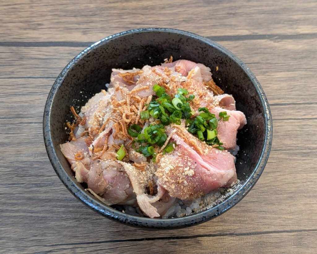 しっとりとしたローストポークが贅沢に盛られ、香ばしい揚げネギとゴマの風味がアクセントになっている。甘めのタレが全体をまとめていて、ラーメンとのセットでしっかり満腹感が得られる