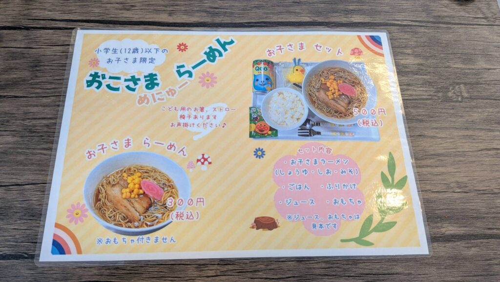 12歳以下限定で「お子さまラーメン(300円)」と「お子さまセット(500円)」を提供。セットにはジュースやおもちゃも含まれ、子ども連れでも安心して来店できる。店内には子ども用の椅子や食器も用意されていた。
