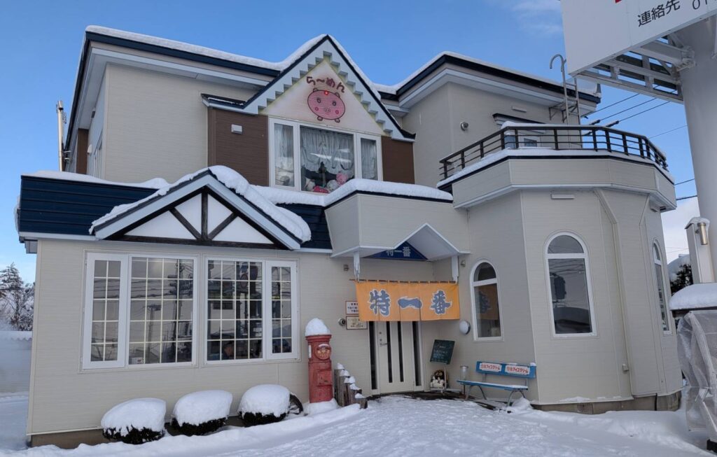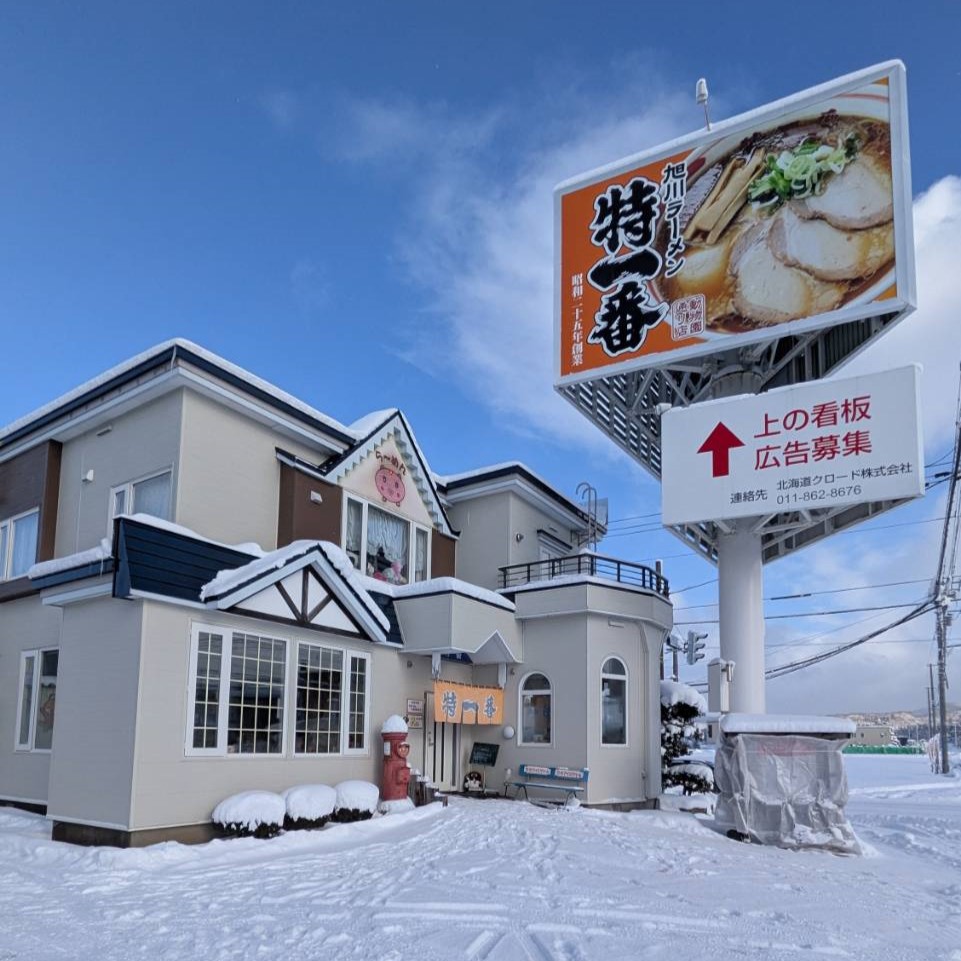 動物園通り沿い、雪に覆われた真っ白な町並みに突如現れるレトロな建物。看板の「特一番」の文字が堂々としていて、初めてでもすぐに見つけられる。