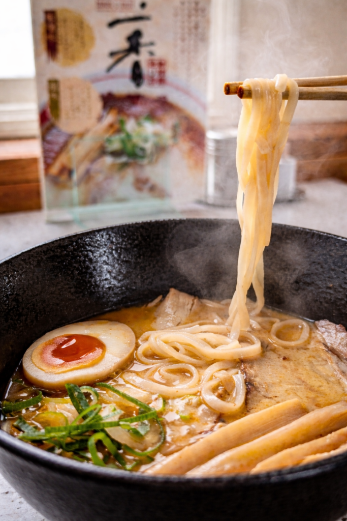 使用されている麺は、旭川の老舗製麺所「北海製麺」が作っているグルテンフリー麺。製麺所の技術力が詰まったこの麺は、米粉特有の優しさと、しっかりとしたコシを両立している。