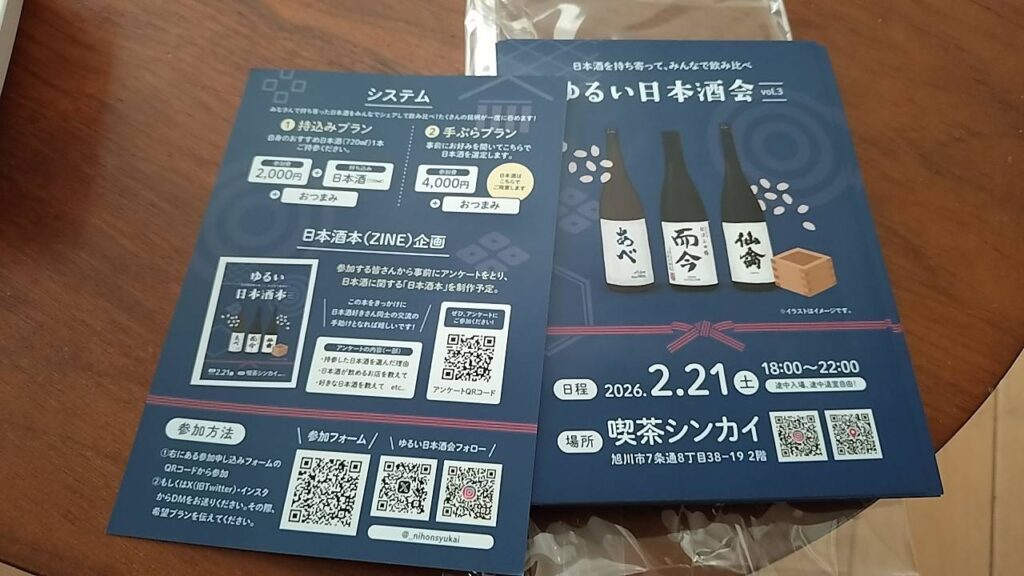 720ml(四合瓶)の日本酒とおつまみを持ち寄り、みんなでシェアしながら飲む日本酒会が開催されます。企画したのは日本酒好きで今まで約350種類飲んできた旭川市在住のDaiさんと、nozkuさん。今までは知り合った日本酒好きの友人を5〜6人ほど誘い、駅前ビルにあったレンタルフリースペースで開催していた日本酒会。利用していたフリースペースの利用が難しくなったことと、哲学カフェを開催する喫茶シンカイに主催が足を運んだことがきっかけで、喫茶シンカイ(旭川市7条通8丁目38−19 2階)での開催が決定しました。