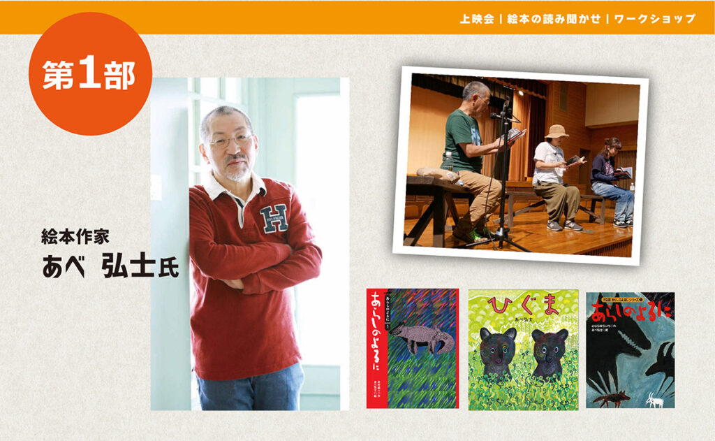 OMO7旭川提供の映像『あらしのよるに』上映(約20分)に続き、絵本作家のあべ 弘士さんによる新作絵本の読み聞かせを行います。