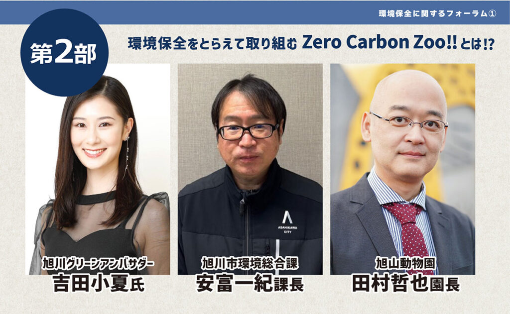 第2部は、旭山動物園の取り組み「Zero Carbon ZOO」をテーマに、脱炭素の取り組みを地域の環境保全として捉え直すトークです。登壇は、田村哲也氏(旭山動物園 園長)、安富一紀氏(旭川市環境部 ゼロカーボン担当)、吉田小夏氏(旭川市グリーンアンバサダー)。動物園・行政・発信者の立場から具体的な視点を共有します。