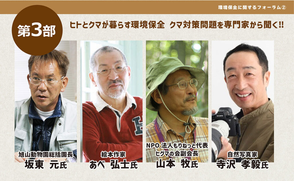 第3部は「ヒトとクマが暮らす環境保全」をテーマに、現場で起きていることを踏まえながら、私たちが知っておきたい論点を整理します。登壇は、坂東 元氏、あべ弘士氏、山本 牧氏、寺沢孝毅氏。進行は当法人理事長 森 禎宏が務めます。