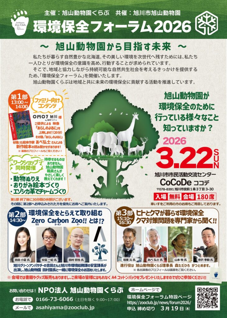 特定非営利活動法人 旭山動物園くらぶは、旭川市旭山動物園との共催により、2026年3月22日(日)に 「環境保全フォーラム2026~旭山動物園から目指す未来~」を開催します。